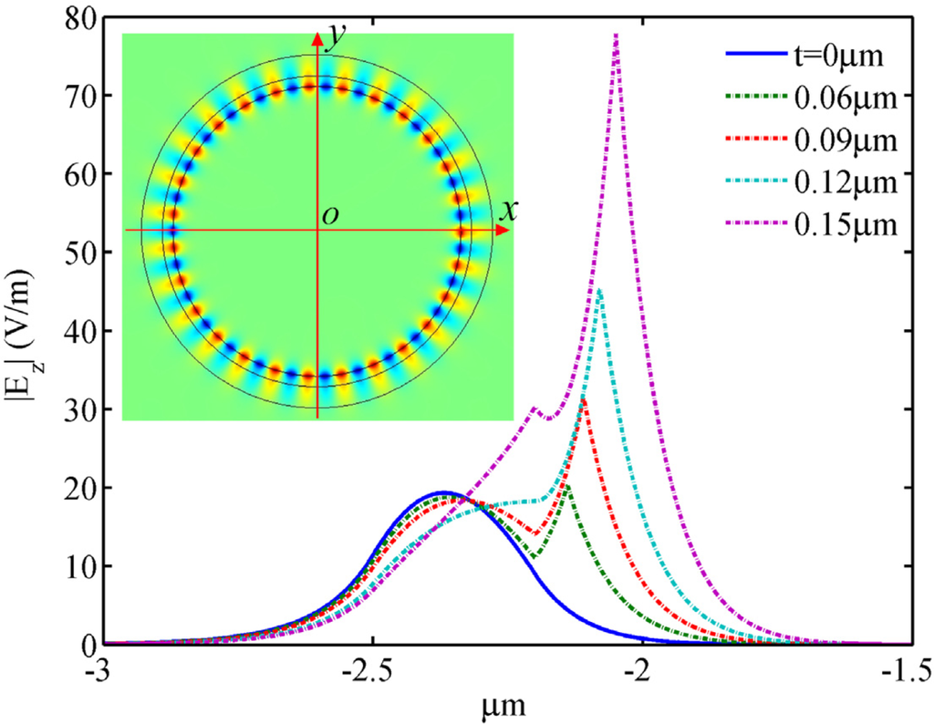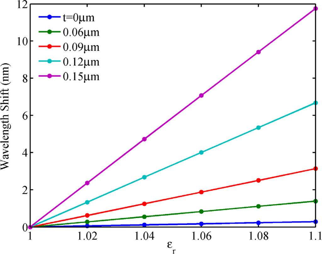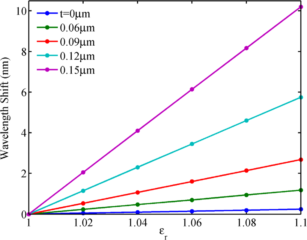 To reveal the mechanism behind these phenomena, we plotted the electric field distribution of the NPM sensor along the x axis from −3 μm to −1.5 μm for mode 27, as shown in Figure 7. Permittivity of the core medium is set to be εr = 1. It is seen that the electric field intensity increases with NPM layer thickness (t). The inset shows the electric field distribution of the NPM sensor. From Figure 7, we can clearly observe that the stronger electric field of evanescent wave penetrates into the detecting region when the thickness of NPM layer increases. Figure 8 shows the relation between core medium permittivity and wavelength shift for different NPM layer thickness. Permittivity of the core medium increases from 1 to 1.1 with an interval of 0.02. Resonant wavelength shift is calculated by Δλ = λ(εr,t) – λ(1,t). For the microring sensor (t = 0), the sensitivity is only 5.9 nm/RIU. For the NPM sensor, the sensitivity increases with NPM layer thickness. When the thickness of the NPM layer is 0.06 μm, 0.09 μm, 0.12 μm, and 0.15 μm, the corresponding sensitivity will be 28.4 nm/RIU, 64.2 nm/RIU, 136.8 nm/RIU, and 240.7 nm/RIU, respectively. Therefore, the essence for the enhancement of sensitivity is the evanescent wave amplified by the metamaterial. Interestingly, we find that the sensitivity of the NPM sensor can be up to 327.3 nm/RIU when NPM thickness is 0.174 μm. But when the thickness is larger than 0.174 μm, WGM with m = 27 will be transferred to the WGM with m = 26 or 28. Details are not shown here for brevity.