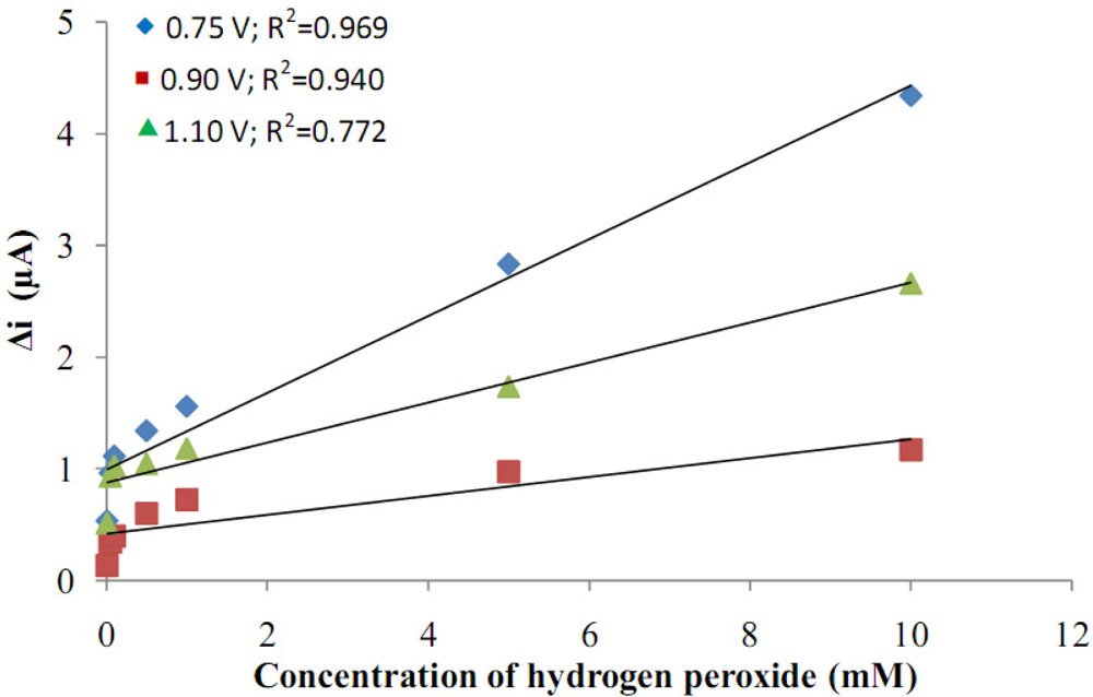 When the graphic was examined, it was seen that the variation in current was higher at high potentials than at low potentials. In the studies which were made in 0.10 V and 0.20 V, current values were observed to be nearly zero. Because of this, the current values that were measured at these potentials haven’t been shown in the graphic. It was seen that the linearity of curves at high potentials was higher. It is known that interference effects of the substances present in body fluids (e.g., ascorbic acid, uric acid) are more significant at high potentials [9]. Because of this, even though the linearity of curves at high potentials was higher, these potentials weren’t chosen as working potentials. At 0.30 V, a potential where interference effects could be low, the correlation coefficient was low. Because of the correlation coefficient of the line occurring at 0.40 V was better, 0.40 V were chosen as the working potential.