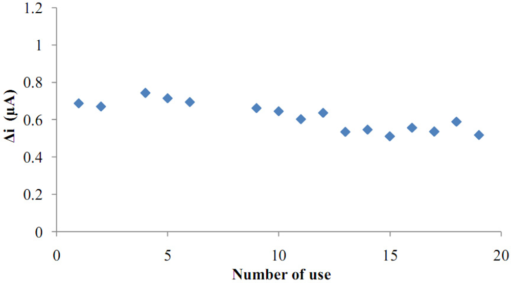 The operational stability of the biosensor was studied by performing the activity assay (under optimum conditions) 16 times in the same day at constant temperature, pH and substrate concentration (1.0 × 10−5 M). At the end of the 16 measurements, the biosensor had lost 25% of its initial activity (Figure 10). After enzyme immobilization, the enzyme was checked to see if it infiltrated from the pores of the polymer. For this purpose, the enzyme electrode was stored in buffer for a few days. Then, substrate was added to the buffer and the presence of hydrogen peroxide in solution was tested. No hydrogen peroxide signal was observed at 0.4 V. As a result, it was seen that enzyme had not separated from the surface of the electrode. In the entrapment technique, enzyme activity is protected very well. For these reasons, good reproducibility was observed, even for high glucose concentrations.