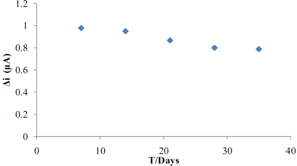 Storage stability of the biosensor was determined by performing activity assays within 40 days. The activity assay was applied within 40 days to determine the storage stability of the immobilized enzyme. As shown in Figure 11, an activity loss of 19.4% was observed on the 40th day.
