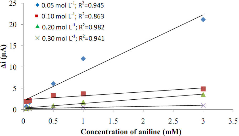The electrodes’ sensitivity to hydrogen peroxide was investigated in order to elucidate the role of aniline concentration (Figure 2). Four different aniline concentrations (0.05, 0.1, 0.2, 0.3 M) were used. Figure 2 indicates that the current response of the electrode covered in 0.3 M aniline was the lowest, and the surface of this electrode was not homogeneous. The polymer coverage easily peeled from the surface. It was concluded that a high aniline concentration was not suitable for polymer coverage. When the aniline concentration was 0.05 M, it was seen that the current was high. It was observed that the thickness of the polymer formed on the Pt surface by 0.05 M aniline was very thin. During the experiment, as the hydrogen peroxide concentration was increased, the polymer film was becoming thinner and the bare Pt surface came out. The surface deformation could be seen with the naked eye. Because of that, the current values were high in the covers made in 0.05 M concentration. The highest correlation coefficient was observed in 0.2 M pyrrole. For the electrodes prepared by 0.2 M aniline, the surface of the electrode was more homogeneous and stronger than the others. Because of that, the aniline concentration was taken as 0.2 M in the subsequent studies.