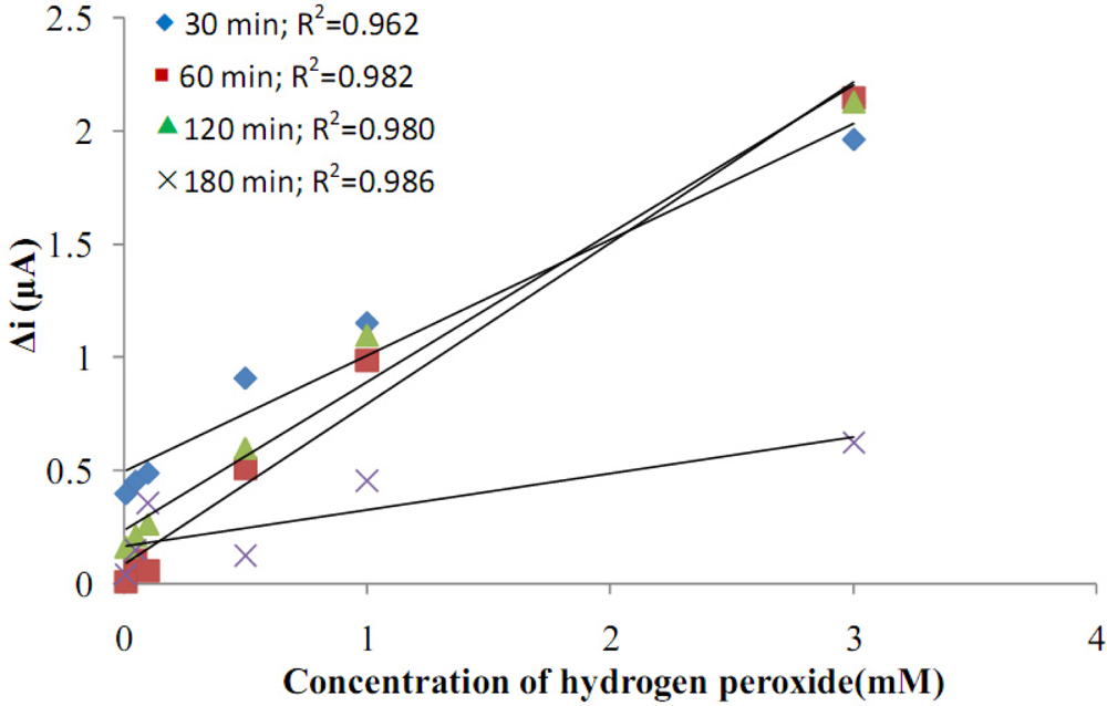 The effects of film thickness on the response currents of the electrodes against hydrogen peroxide concentration were investigated (Figure 3). By growing the polymer on the platinum electrode for different time periods (30, 60, 120, 180 min), electrodes with different film thicknesses were prepared. It was observed that the thickness of the polymer formed on the Pt surface in 30 min was too thin. During the experiment, as the hydrogen peroxide concentration was increased, the polymer film was getting thinner and the bare Pt surface was exposed. The correlation coefficient for the 180 min coverage was high, but currents were very low. The thickness of the polymers formed on the Pt surface in 120 and 180 min were too thick and easily broke down and contaminated the solution. Because of this, they could not be used. For the electrodes prepared in 60 min, the surface of the electrode was more smooth and strong than the others. They also had much more mechanical strength and reproducibility. Also, the correlation coefficient of the graphic which was drawn for the film that was covered for 60 min, was highest. Because of these reasons, 60 min covering time was used.