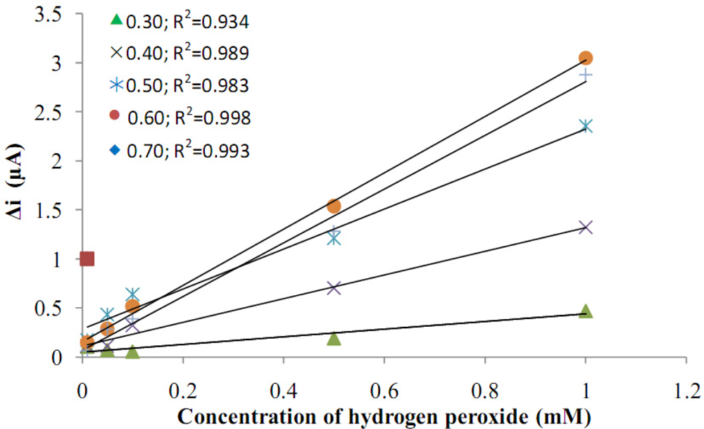 After preparing Pt/Pani-Pvs electrodes, the hydrogen peroxide oxidation was carried out at different potentials (0.10, 0.20, 0.30, 0.40, 0.50, 0.60, 0.70 V, Figure 4). Current differences of H2O2 (0.1 mM) at the different potentials were measured using a Pt/Pani-Pvs electrode and plotted against potential.