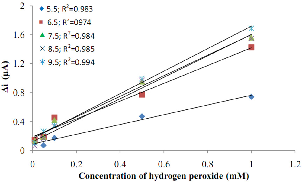 The sensitivity of the electrode to H2O2 was investigated at five different pH values (5.5, 6.5, 7.5, 8.5, 9.5). Current values that were obtained were drawn against H2O2 concentration. When Figure 5 was examined, it was seen that the H2O2 anodic currents increased with the increase in pH value. The lowest anodic currents were seen at pH = 5.5. Anodic currents after pH = 6.5 were much higher, but there weren’t any very big changes in currents between the pH values 6.5–9.5. As a result, the pH values after 6.5 could be more suitable for the biosensors made with Pani-Pvs film.