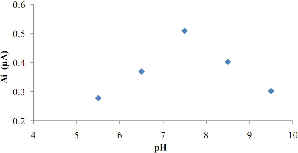 Buffer (phosphate buffer) solutions at various pH values were tested to investigate the effect of pH. The pH values of the buffer solutions were varied between 5.5 and 9.5. The measurements were performed at a constant glucose concentration of 1.0 × 10−5 M. Figure 6 shows that the maximum response was obtained at pH 7.5. For glucose biosensors pH values other than 7.5 were employed in the literature (pH 6.5; 7.4) [10,11]. This was attributed to the fact that the polymer used and the type of immobilization were different.