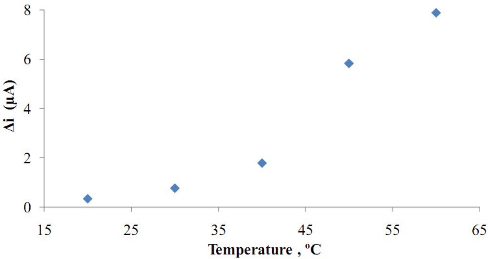 Temperature has a great effect on enzyme activity and it is important to investigate the temperature’s dependence of the response of the enzyme electrode. The temperature’s influence on the response of glucose enzyme electrode was tested between 20 °C and 60 °C at pH 7.5 using a constant glucose concentration of 1.0 × 10−5 M (Figure 7).