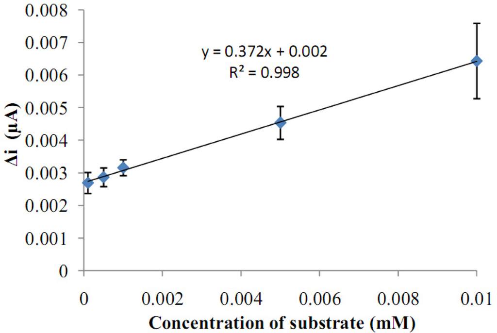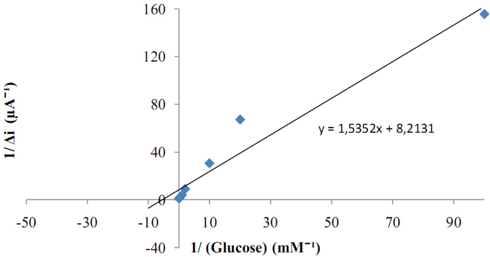 There are linear parts ranging between 1.0 × 10−7–1.0 × 10−5 M (R2: 0.999). The graph for the calibration curve was given in Figure 8. It was shown that the linearity of graph was highly satisfactory and it could be used for the quantitative determination of glucose. The detection limit of the biosensor was 1.0 × 10−7 M and the response time of the biosensor was 200 s. Kinetic parameters Km(app) and Imax for the enzyme biosensor were detected at constant temperature (25 °C) and pH (pH 7.5) for varying substrate concentrations. Km(app) and Imax were calculated as 0.186 mM, 0.121 μA/min respectively by using 1/[glucose]−1/Δi graph (Lineweaver-Burk plot) (Figure 9). Km values for immobilized glucose oxidase presented in the literature are 18.0, 11.9, 9.34 mM [10,15,16]. This was attributed to the fact that the polymer used and the type of immobilization were different.