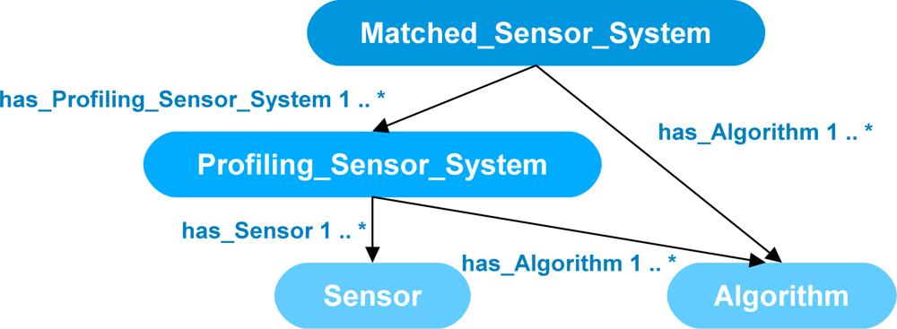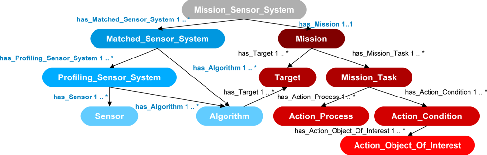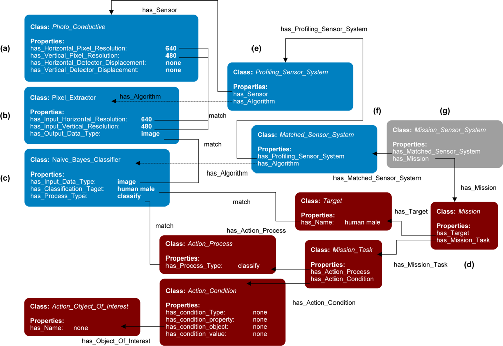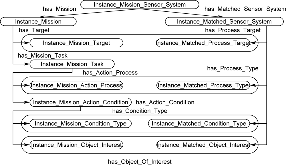 A Mission_Sensor_System class describes a possible combination of Matched_Sensor_System instances and a Mission instance through the two object type properties has_Matched_Sensor_System and has_Mission. A Mission_Sensor_System may have many Matched_Sensor_System instances but one only Mission instance. The Mission class describes the various specifications of a mission. The Mission class leverages two other classes, Target and Mission_Task, to define mission specifications. The Target class describes the object that the mission needs to detect, such as human or animal. The Mission_Task class describes the process and condition which must take place on the Target instance. To define the process specification, the Mission_Task leverages two other classes: Action_Process and Action_Condition. The Action_Process class describes a specification process, such as “classify” or “visualize” for the detected Target instance. The Action_Condition class describes further specifications that the Action_Process might require. Last, the class Action_Object_Of_Interest describes objects that a Target instance may be associated with, for example, objects that may be carried by a human or animal.