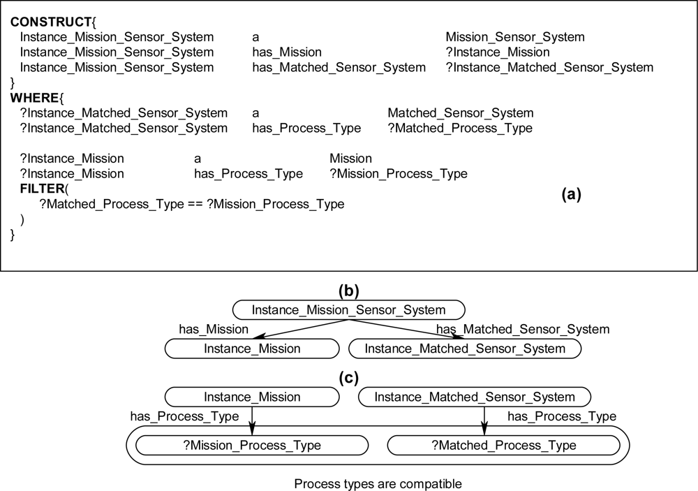 New rules were developed for assigning the synthesis of systems to missions, thus returning possible Mission_Sensor_System instances. Figure 11 shows an example SPARQL rule that queries the existing instance data and returns a Mission_Sensor_System instance in the CONSTRUCT clause when the properties and logical constraints are satisfied in the WHERE clause. The CONSTRUCT clause in Figure 11(a) contains three statements. The first statement declares the object instance Instance_Mission_Sensor_System to be of class type Mission_Sensor_System. The second two statements establish links to the possible existing instances through the two properties: has_Mission and has_Matched_Sensor_System. To establish these two links, the two properties are linked to two variables Instance_Mission and Instance_Matched_Sensor_System, respectively. The WHERE clause in Figure 11(b) contains five statements. In the first two statements, the object variable Instance_Matched_Sensor_System is instantiated with an instance of class type Matched_Sensor_System and the variable Matched_Process_Type is instantiated with the value from the data type property has_Process_Type from the same Matched_Sensor_System instance. In the second two statements, the object variable Instance_Mission is instantiated with an instance of class type Mission and the variable Mission_Process_Type is instantiated with the value from the data type property has_Process_Type from the same Mission instance. The final statement in the WHERE clause contains the FILTER command which appears as a simple logical constraint that compares two variables. This particular FILTER command compares the two data type variables Matched_Process_Type and Mission_Process_Type for equality. When the inference engine processes this rule, the CONSTRUCT clause will return a possible Mission_Sensor_System instance with links to a Matched_Sensor_System instance and links to an assigned Mission instance if the two instances and properties exist and if the two properties are equal in the WHERE clause. Once a Mission_Sensor_System instance has been returned by the rules, the ontological framework can then execute the mission by coordinating all synthesized systems, sensors, and algorithms assigned to that mission and returning the results of the mission via a procedural attachment statement.