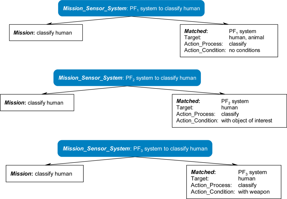 The challenge for the ontological problem-solving framework was to assign a synthesis of systems to subtasks of mission specifications. Even though the rules described in this paper contain relatively simple compatibility constraints among sensors, algorithms, and missions, these rules illustrate an important proof-of-concept. Namely, a problem-solving approach to matching Sensor and Algorithm instances to form synthesized Matched_Sensor_System and Profiling_Sensor_System instances which are then assigned to high-level Mission instances to form a Mission_Sensor_System instance that is ready to be executed by the ontological framework or other autonomous systems for mission completion. It is important to note that multiple Matched_Sensor_System instances were reused and assigned to different Mission instances, which the Matched_Sensor_System instances were capable of satisfying. For example, the Matched_Sensor_System PF5 instance, which is capable of visualizing a human carrying an object, was assigned to three different Mission instances that required the detection of “humans” with and without various objects, such as “weapons” or “backpacks”. It is important to realize that the Mission_Sensor_System is more than just sensors and algorithms assigned to a mission, the Mission_Sensor_System is a synthesized system, which is capable of performing the assigned subtasks to satisfy the overall mission specification and returning results for further analysis or more complex missions.