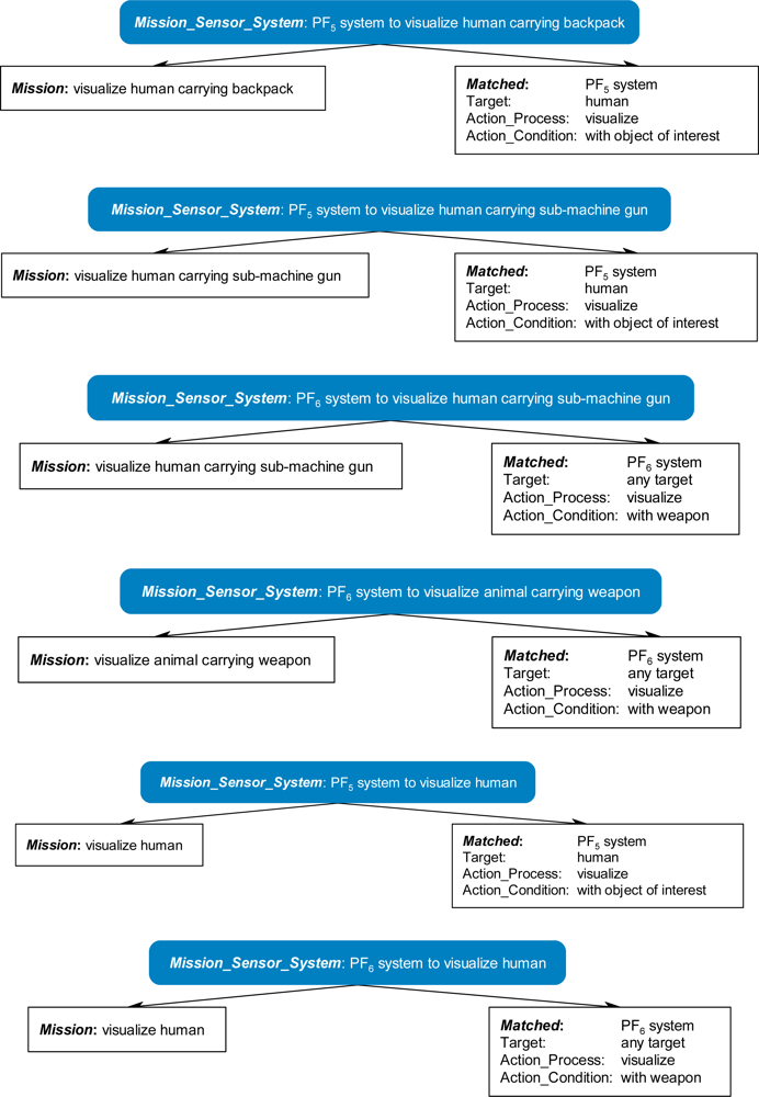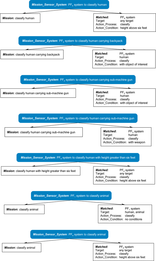 When the ontological problem-solving framework begins, the inference cycle processes the rules similar to those in Figures 12 and 13. When the inference cycles terminate, sixteen new Mission_Sensor_System instances were returned as shown in Figure 16. From Figure 16, multiple Matched_Sensor_System instances were matched to a single Mission instance while in some cases a single Matched_Sensor_System instance was matched to multiple Mission instances. For example, the Mission instance “classify human carrying sub-machine gun” can be completed by two different Matched_Sensor_System instances: “PF2 system” and “PF3 system” because the Action_Process “classify” of the Mission matched the Process_Type “classify” of both PFx systems and each of the Mission instance Action_Object_Of_Interest “sub-machine gun” matched the Action_Condition of both PFx systems. This particular assignment also represents how the authors chose to handle subsumption with a semantic distance threshold in that the Action_Condition of both PFx systems were not “sub-machine gun” but “object of interest” and “weapon”, which are each super classes of “sub-machine gun”. Assigning matched systems in this way allows the ontological framework to “best fit” a mission to a synthesis of systems. Also the Matched_Sensor_System instance “PF5 system” can complete three different Mission instances: “visualize human carrying backpack”, “visualize human carrying sub-machine gun”, and “visualize human”.