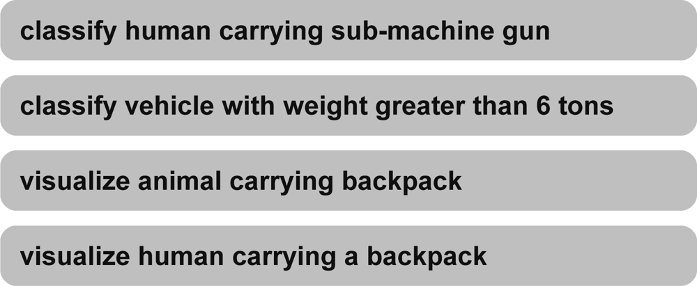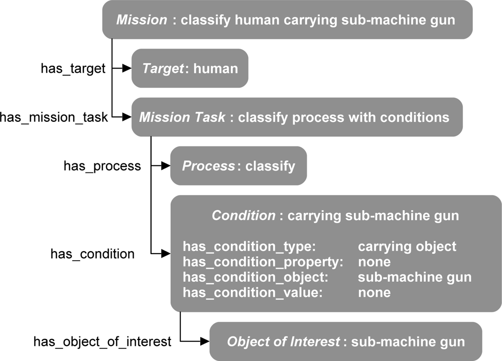 The authors and SMEs then analyzed the typical missions to yield a set of specifications that could be used to describe the missions. The specifications included a target that must be detected, such as a human or vehicle, and a mission task for describing a subtask that describes a process and condition which takes place on the target. A process describes what must happen on the detected target, such as “classification”, “visualization”, or “signal profile generation”. The process may have ancillary conditions, such as target is carrying a “weapon” or “backpack” or even a condition of target has “weight greater than six tons”. A specification is shown in Figure 5 via an instance diagram.