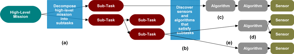 With the high-level missions decomposed into a set of mission specifications, a problem-solving approach must then assign matched sensor systems and algorithms to the subtasks which satisfy the mission specification as indicated in Figure 6. The problem-solving approach must discover which systems can satisfy the given subtasks as illustrated in Figure 6(b). Once systems have been discovered, the interoperation of multiple sensors and algorithms must be coordinated to perform a subtask as indicated in Figure 6(c–e). To perform these operations, the ontological framework must describe relationships among the sensors, algorithms, and missions in terms of how the subtasks relate to the mission, relationships among subtasks and compatible sensors and algorithms, and the relationships between the sensors and algorithms. Section 5 details how the developed concept of a mission was integrated into the authors’ previous work.