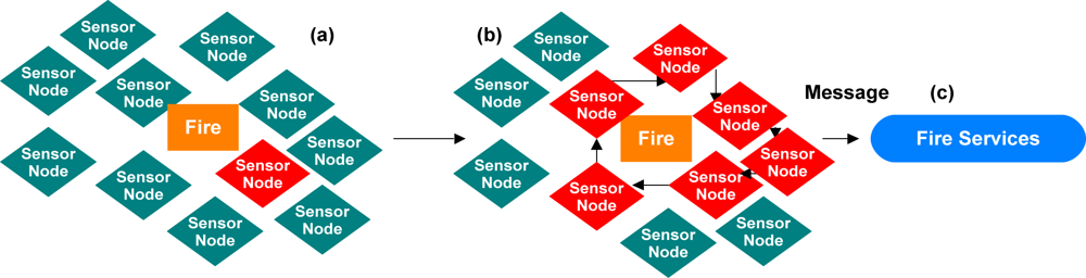 One example system, Agilla [21–23], is a framework used to monitor sensor systems connected to a sensor network. Agilla uses protocols with specific conditions that, when met, will perform a specific action or actions. For example, the actions and conditions may be to activate other protocols when a sensor reports a temperature above a specific threshold. The newly activated protocols may then coordinate other sensors to collect data, invoke algorithms for further analysis, or even activate more protocols to perform a specific action or actions. Figure 7(a) shows an Agilla network with a fire detection protocol on one sensor node. The fire detection protocol has the task of detecting a temperature above a specific threshold. Once the temperature threshold is reached, the protocol will activate other fire detection protocols on more sensors nodes, Figure 7(b). As the protocols activate on the other sensor nodes, the protocols will determine the perimeter of the fire and then send the perimeter data to a new protocol, Figure 7(c), which then activates fire services [21–23]. Another example system, Geographical Information System Framework [24,25], leverages several different frameworks in the overall management of sensor systems and algorithms on a sensor network as depicted in Figure 8. The framework includes knowledge models, such as ontologies, for describing sensors, algorithms, and tasks. Service-oriented architectures are used to handle communications among all systems, and geographic information system placement logic is used for tasking. The different frameworks operating together allow end users or autonomous systems to query the framework for available sensor systems and then task the sensor systems to retrieve data or to perform specific actions based on sensor data [24,25].