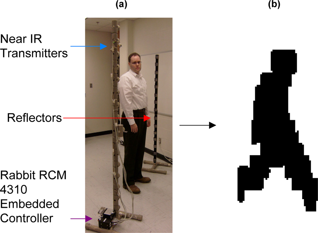 Figure 9(a) shows a sparse detector PFx sensor consisting of sixteen near-infrared detectors in a vertical deployment with no relative horizontal displacement and a reflector pole. When an object passes between the two poles, which is the field of view of the sensors, the resulting signal will be recorded. An algorithm then processes the signal by formatting the raw sensor data using run-length encoding. The formatted sensor data may be used by other algorithms to visualize the acquired data as a silhouette shown in Figure 9(b). Other possible configurations of a vertical near infrared sparse detector may include a horizontal displacement, which may be used to determine the velocity of an object [46–53]. The chain of creating raw sensor data, generating profiles, and then processing the profiles for visualization or classification provides a unique opportunity to show how the prototype ontological framework can autonomously assign the PFx sensors and algorithms to the subtasks of various missions based on their relationships and capabilities.