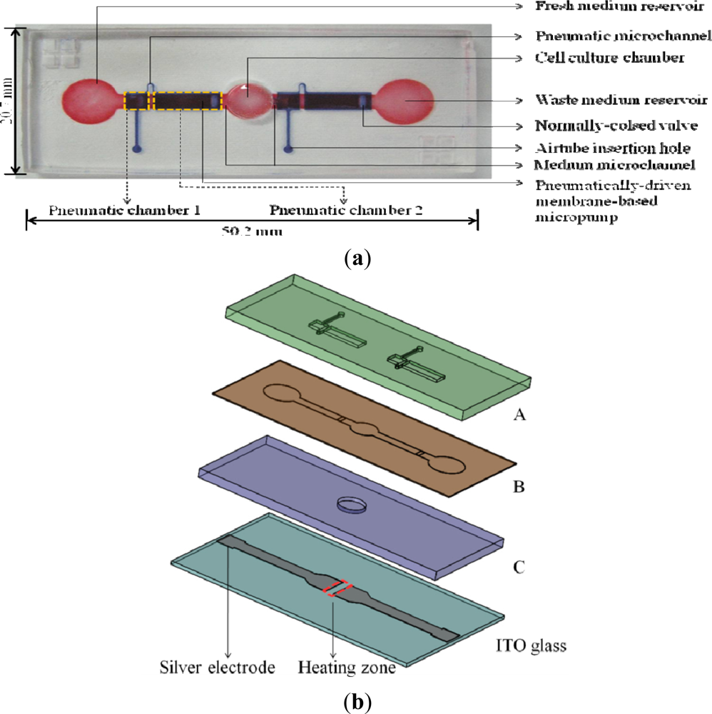 It comprises fresh and waste medium reservoirs (D: 5 mm, H: 5 mm), two medium microchannels (W: 2 mm, L: 5 mm, H: 200 μm) located at the both sides of a cell culture chamber (D: 5 mm, H: 200 μm), and two pneumatically-driven membrane-based micropumps located on both sides of the cell culture chamber. In each pneumatic micropump, two pneumatic chambers (pneumatic chamber 1: L: 2.5 mm, W: 2.5 mm, H: 0.5 mm; pneumatic chamber 2: L: 7.5 mm, W: 2.5 mm, H: 0.5 mm) connected by a pneumatic microchannel were designed. In terms of operation, the fresh medium reservoir was designed to be loaded with cell culture medium, and the loaded medium was then driven by the incorporated pneumatically-driven membrane-based micropumps coupled with normally-closed valves [Figure 1(a)]. The assembly of the cell culture chip is schematically illustrated in Figure 1(b). Briefly, three layers of microfabricated PDMS plates (A to C) were permanently bonded by plasma oxidation treatments. This was followed by attaching them to the microfabricated ITO glass, whereby the cell culture chamber is just located on the heating zone of ITO glass. ITO-glass substrate is a transparent conductive material which can generate heat due to its electric resistance when an electric current passes through. Two silver electrodes were patterned on the proposed ITO-glass microheater chip [Figure 1(b)], in which the area (5 × 5 mm2) between the silver electrodes serves as a heating zone.