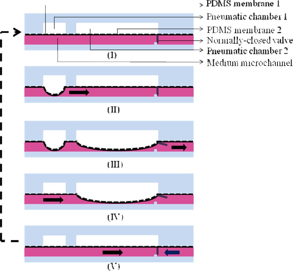 One of the key features of the proposed cell culture system is the backflow-free medium perfusion function. In this study, two pneumatically-driven membrane-based micropumps coupled with normally-closed valves were integrated to continuously deliver the loaded culture medium flowing from the fresh medium reservoir through the cell culture chamber [Figure 1(a)]. The working principle of medium pumping is based on the pneumatically-driven pulsations of the elastic PDMS membranes located above the medium microchannel to deliver medium forwards. The detailed pumping mechanism is illustrated in Figure 2. Briefly, when the pneumatic chambers of micropumps are pressurized it first causes the deformation of PDMS membrane 1 [Figure 2(II)], and then PDMS membrane 2 [Figure 2(III)]. The sequential effect of the membrane movement is mainly created by the effect of fluidic resistance during the pressurization of the pneumatic chamber 1 and 2 (readers should also refer to Figure 1(a)). In this process, the deformation of the PDMS membrane 1 not only squeezes the fluid in the medium microchannel bidirectionally but, more importantly, functions as an active valve [Figure 2(II)]. The latter ensures that the liquid flow is driven downstream when the PDMS membrane 2 is deformed [Figure 2(III)]. Apart from pumping the liquid forwards, the deformation of the PDMS membrane 2 also mechanically opens the normally-closed valve (an auxiliary elastic PDMS membrane affixed to the PDMS membrane 2; T: 500 μm, W: 2 mm, H: 180 μm), which allows the fluid driven by the deformation of the PDMS membrane 2 to pass through [Figure 2(III)]. Conversely, when the pneumatic pressure in the pneumatic chamber 1 and 2 is released, the deformed PDMS membrane 1 first goes back to its rest state [Figure 2(IV)]. This is followed by the release of membrane 2 [Figure 2(V)], by which the valve again returns to its normally-closed state [Figure 2(V)]. With this approach, any backflow of the pumping fluid can be physically prevented and therefore, the net medium flow is driven downstream.