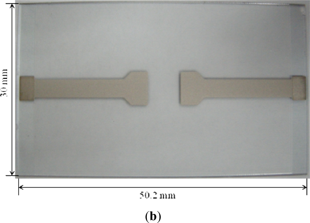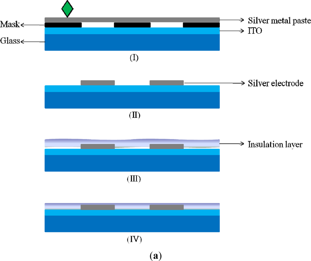 For the fabrication of ITO-glass microheater chip, two silver electrodes were directly screen printed on a rectangular ITO glass with a defined heating zone of 5 × 5 mm2 (the area in-between the two silver electrodes; Figure 1(b)). The overall fabrication process is schematically illustrated in Figure 3(a). Briefly, a silver metal paste (DW-250H-5, Toyobo Co., Japan) was screen-printed onto an ITO glass substrate (100 Ω/□, Ritek Corp., Taiwan), and was then dried at 150 °C for 40 min [Figure 3(a)-I]. During this stage, the solvent was removed, and the prints (film thickness: 10 μm) adhered onto the ITO-glass [Figure 3(a)-II]. After that, a 15 μm-thick insulation layer (IR-T013PJ, Full-wing Co., Taiwan) was then screen-printed on the top of the fabricated ITO-glass [Figure 3(a)-III], followed by curing at 130 °C for 10 min [Figure 3(a)-IV]. A photograph of the fabricated ITO-glass microheater chip is shown in Figure 3(b).
