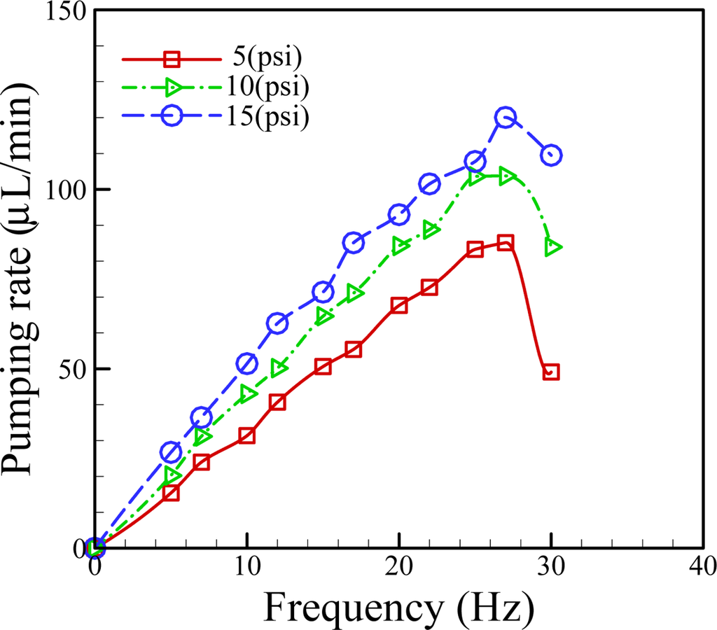 In the proposed medium pumping scheme, the volumetric flow rate is dominated by the applied pneumatic pressure, and its frequency. To find out the quantitative links between them, the volumetric pumping rate measurements at various applied pneumatic pressures (5, 10 and 15 psi) and frequencies (5–30 Hz) were carried out. Results (Figure 4) revealed that, within the experimental conditions investigated, the pumping rate profiles showed the similar pattern, in which the pumping rate increased first with the increase of applied frequency, and followed by a decline with the saturation flow rate occurred at the frequency of 26 Hz.