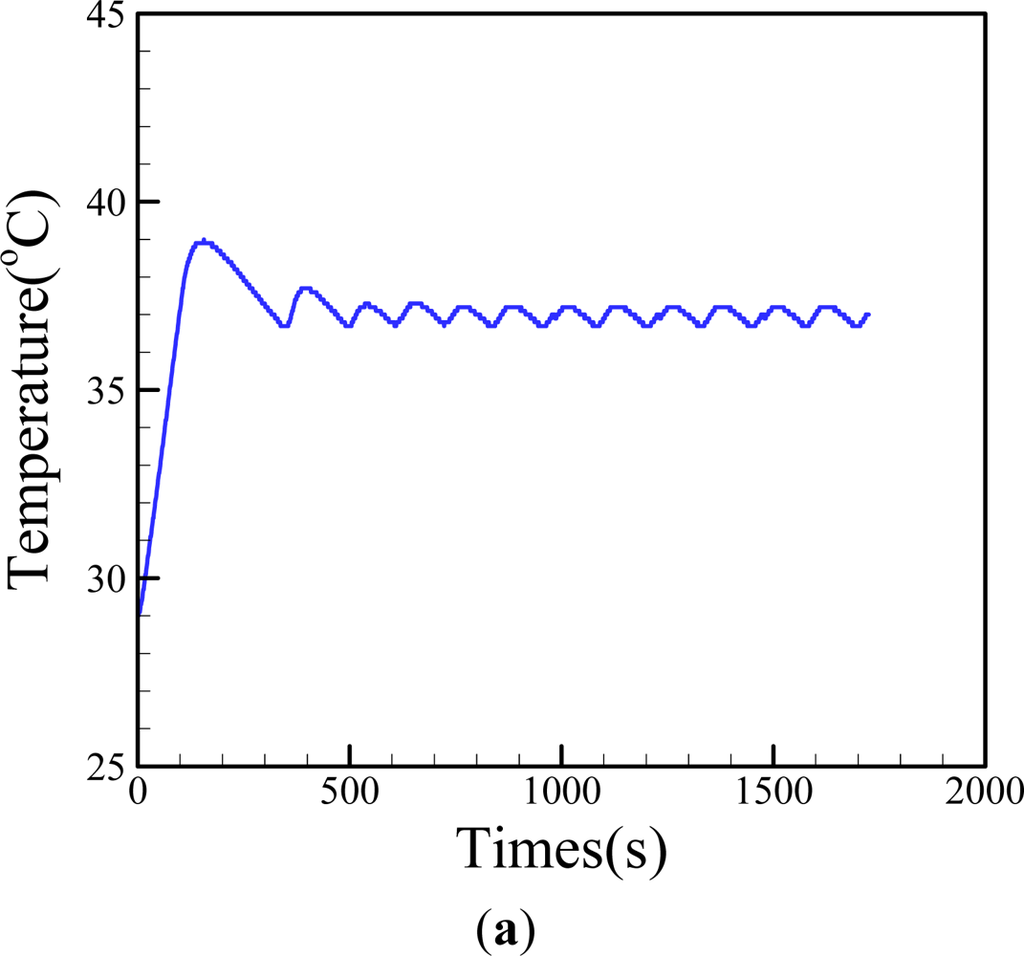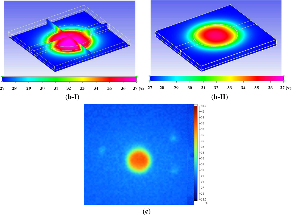 Apart from the numerical simulation, a thermal infrared (IR) imager (Infrared Thermography TVS-200N, Nippon Avionics Co Ltd., Japan) was used to explore the uniformity of thermal field on the proposed cell culture system. Before the observation, the accuracy of the temperature measurement was checked to be ±1 °C. In this work, the focal plane was perpendicular to the detective light, and the measurement distance to the focal target was set to be 30 cm. In this evaluation, the focal target was the top surface of microfluidic cell culture chip (the emissivity for the IR imaging was set as 0.96 for the PDMS material).