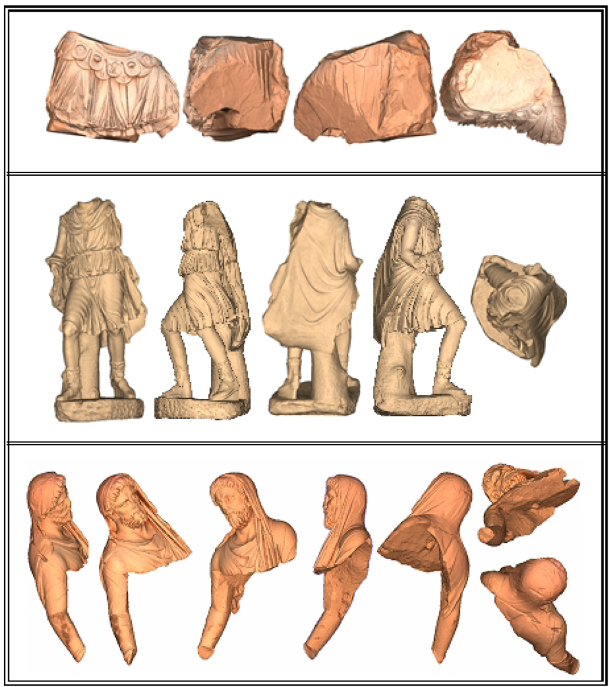 Imagine for a moment that you have to solve a 3D jigsaw of which you have lost several pieces. You have also lost the original box-top showing the final picture, and as if that were not enough, some of the pieces you do have may belong to some other jigsaw. This is in essence the sort of challenge that we faced in the novel project that we shall be describing in this paper. The final aim of the project was, with the help of 3D scanners, to digitalize and reconstruct multi-piece classical sculptures. Particularly, we tackle the restitution of the so-called “Aeneas Group”, a famous iconographic reference during the Roman Empire. We have undertaken this ambitious project in collaboration with the research department of the Spanish National Museum of Roman Art (MNAR). This paper summarizes the real problems that arose and had to be solved, the innovations, and the main results of the work that we have carried out over these recent years.1. Introduction