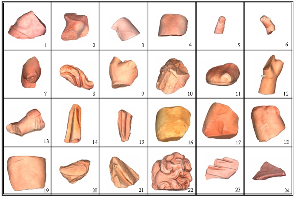 In order to obtain a reliable and effective reconstruction, we considered these hypothesis provided by historians and archaeologists along with the assignation of each fragment to a specific part (or a set of parts) of the body. This is not quantitative but qualitative information which reduces the area of the complete virtual model to which the fragment will be matched. For example, a fragment might be labeled as a part of a foot and, the matching process would therefore be solely restricted to “foot” regions in the virtual model.
