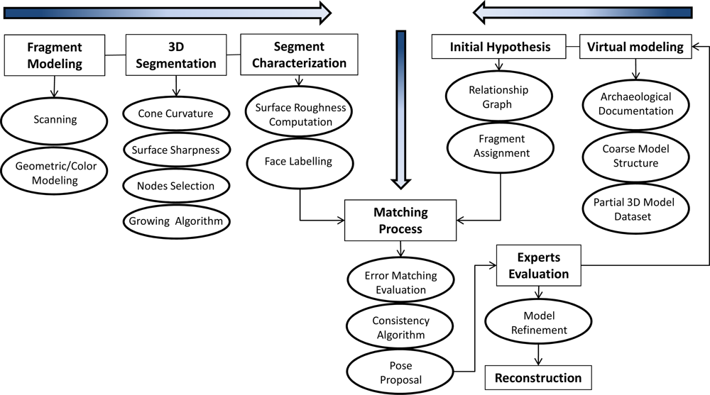 We used a hybrid human-computer strategy to solve this extremely complex incomplete 3D puzzle problem. The main idea is that an interaction between an archaeological knowledge database-built by historians and archaeologists-, and a computer knowledge database-obtained by computer science experts-, is needed to achieve a reliable solution. In Figure 12 an overview of the hybrid human-computer strategy is presented. We will give an explanation of this chart in the following paragraphs.