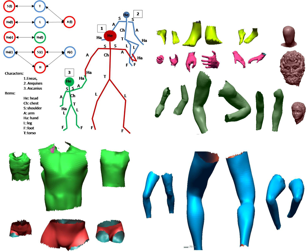 The archaeological knowledge database was obtained from the remains found on the site, from many sources such as paintings, coins, small bas-reliefs and texts. Thus a coarse model of the group was consequently proposed. Essentially, the structure of the sculptural group was: two standing figures with joined hands-which correspond to an adult and a child-, and an old man who is carried on the adult’s shoulders. An elemental structure of the model proposed is shown in Figure 13, in which the body is divided in several parts: head, chest, shoulder, arm, hand, leg, foot and torso. Each part of the body of the three figures was then modeled by taking 3D standard human models. Besides, a neighborhood relationship between some parts of different characters was also established by historians. For example, Aeneas’s right hand and Ascanius’s left hand should be in contact. All this information was used by the modeler to build a rough 3D model of the Aeneas group. Figure 13(b) illustrates the models of different parts of the bodies and the neighborhood graph.
