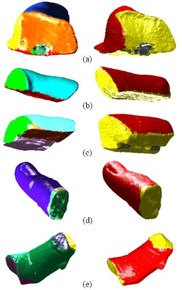 In essence, the segmentation algorithm helps to distinguish between zones of the fragments that belonged to visible parts of the sculpture (the original faces) and those that did not (the fractured faces). Figure 14 shows the results after running the algorithm on some of the generated meshes. This information makes the calculation of the fragments pose onto the virtual model easier.