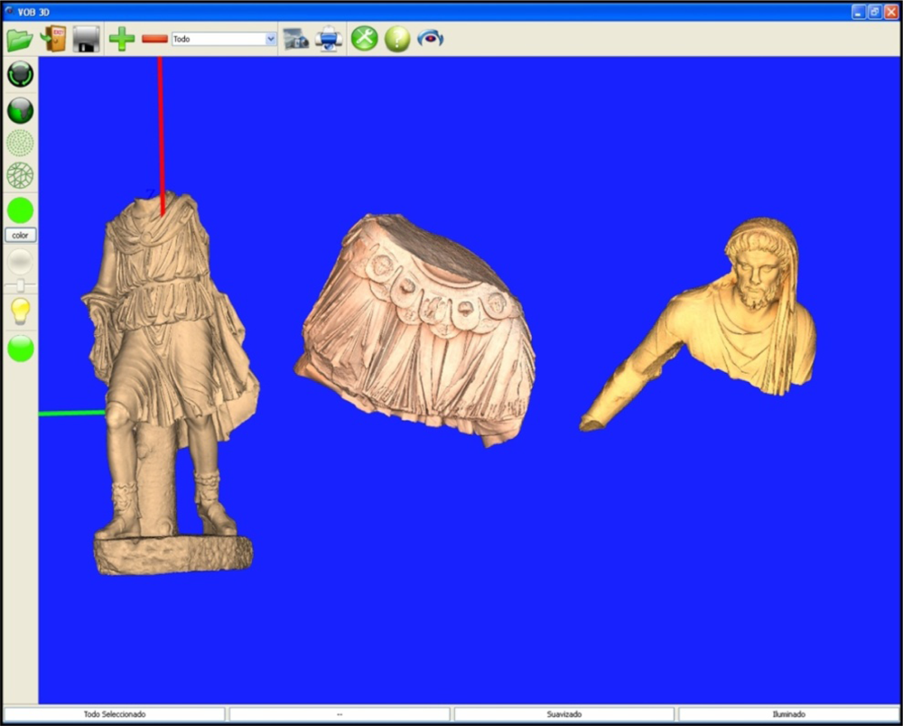 The interactive viewer can handle wrl and vir formats. The vir format is a proprietary format created to safeguard the copyright of the models, which stores information on faces, vertices, and textures. This software is currently being used by historians and archaeologists in the National Museum of Roman Art. Functions that can change the original 3D meshes have not been implemented, since, as was mentioned above, our users are not accustomed to this type of tool. However, other actions related to display, illumination, and elementary measurements are easy to perform. The software also permits several models to be loaded into the same window with the option of moving them around, and allows multiple windows to be open at the same time. Having a virtual model of the statues lets researchers examine them at their leisure, perhaps even discover details they had not noticed in the time they spent with the physical statue, and check their recollections and theories. The ability to precisely control the lighting lets them see the statue as it might have appeared in environments outside the museum, or highlight small details that are not easily visible. Measuring the statue freely and precisely lets historians factor out subjective perceptions, and better understand the artist's use of perspective and composition. Figure 17 is a screen-grab of the interactive viewer with the final models of the three large pieces loaded.