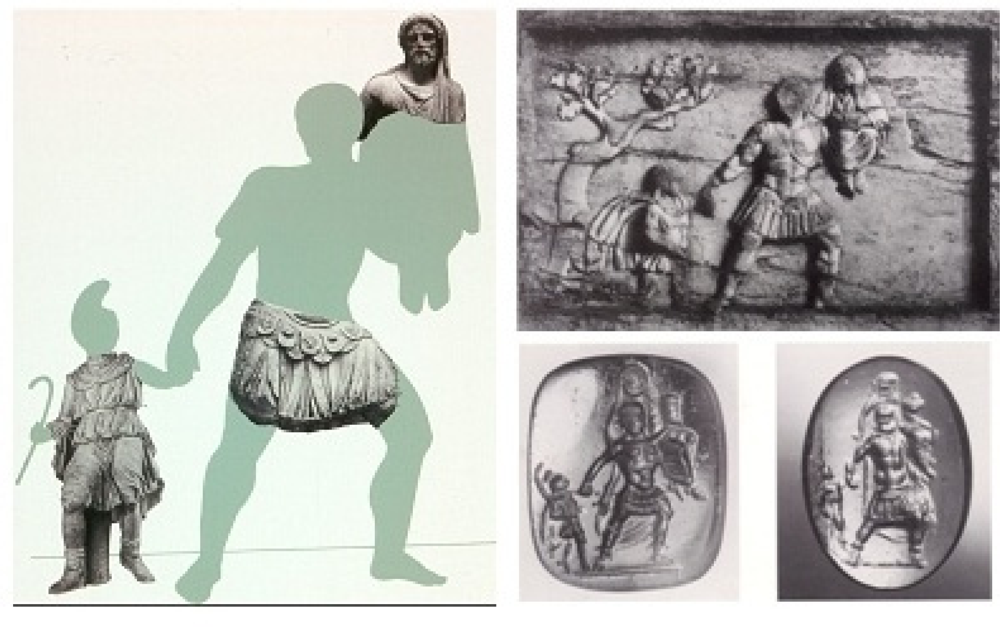 The fundamental studies of Prof. Trillmich on the successive sculptural findings established the connection between these pieces and the hypothetical reconstitution of a single group belonging to the Spanish complex which would have been a provincial replica of the Aeneas Group in the Forum Augustum of Rome, known only from documentary and iconographic references []. The Aeneas Group consisted of three complete human pieces that had an overall size of around 6.5 cubic metres. It represented the figure of Aeneas escaping from Troy, holding his son Ascanius by the hand, and carrying his father Anchises on his shoulder (Figure 3).