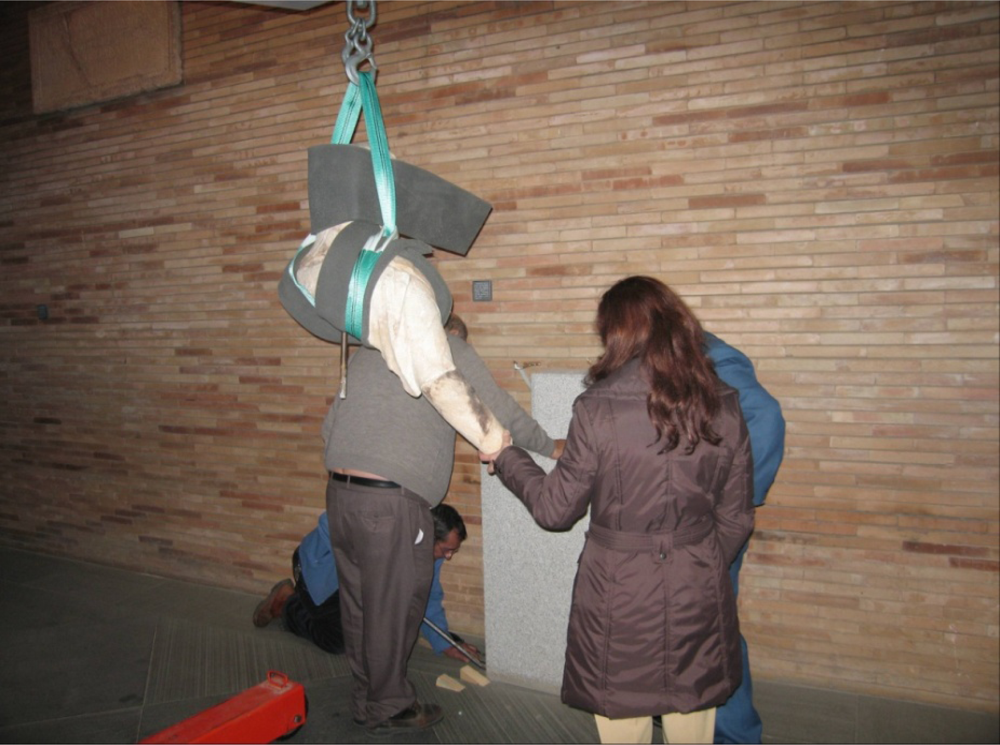 To scan the 25 smaller fragments, we used a rotation table. We thus obtained automatically registered views of the object which were uniformly separated over a complete 360° turn. The figure of Anchises had to be hoisted with a crane and turned to allow us to acquire the back area data. The photographs in Figures 5 and 6 show various moments of the data acquisition process. This stage was carried out in four expeditions of approximately one week, spending five or six full days in the museum on each visit.