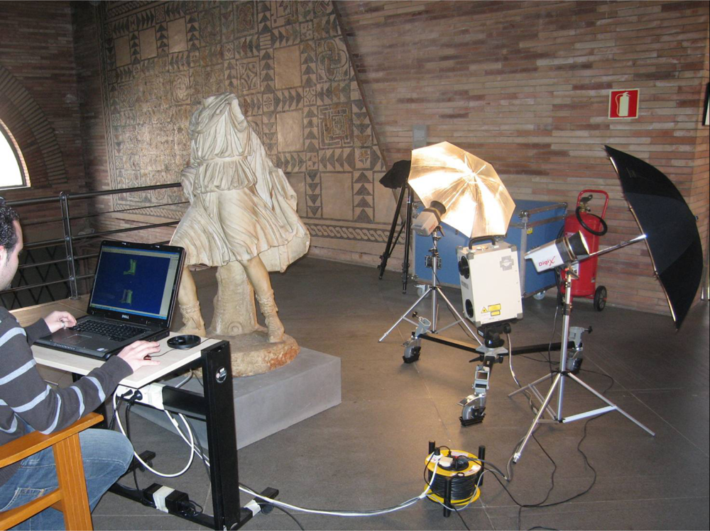 Digitalization of Roman sculptures poses many problems. Roman characters often wear pleated tunics or robes, so that there are many regions which are inaccessible to the scanner. The sculptures are of marble, with the resulting problem of reflections and gleams when the scan is taken, leading to frequent errors in the 3D data and corrupted colours. In order to properly scan the entire piece, one must use elevator platforms. Finally, the massive amount of information in the hundreds of views has to be matched. Our 3D reconstruction method follows the typical stages of the 3D modelling process []. Figure 4 shows a conceptual map of the whole procedure.