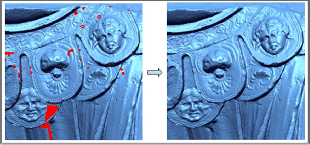 Extensive experimentation with our algorithm demonstrated its robustness in suitably filling holes of any size. Initial work can be found in []. This paper describes a method for filling holes in a 3D partial mesh, which corresponds to only one view of the object. The method presented here is an extension of that work in which the filling hole for a complete mesh model is resolved. Figure 7 illustrates the result of applying this technique to several holes in Aeneas's belt in the geometrical model obtained after the final merge. Holes are depicted in red.