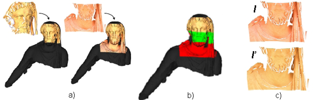 The colour integration algorithm consisted of three stages: initial correction, colour merging and refinement. In the initial correction phase, the colour image of the next view to merge in the sequence (which we will call I) is corrected taking into account its region of intersection with the current integrated texture (which we will call T). Since the colour changes in the objects we were dealing with (marble pieces) were smooth, we used a linear transformation for the relationship between the colours corresponding to the points in the intersection region. Applying this transformation over I, we obtained a corrected colour image I’. We can say that, in this stage, a global strategy which modifies all pixels of I is applied. Figure 8 illustrates this sequential procedure: Figure 8(a) is an example of the sequential integration and illustrates the partial colour mapping superimposed on the geometric model; Figure 8(b) shows the entire geometrical model and the region of intersection between the colour images assigned to the model after n views have been integrated (T) and the image corresponding to the next view to be merged (I) in green; and Figure 8(c) compares the view to be merged before and after the global correction. In the colour merging phase, the RGB components of the overlapping points in the two colour images, T and I’, are subjected to a weighted-mean transformation. The weights assigned to the colours depend to the viewing ray and the surface normal in the complete model and the new scan. We can thus say that, in this stage, a local strategy is taken. Finally, the refinement phase applies two types of filter to the colour images. The discontinuities that typically arise at the seam or edge points after the local correction are resolved using a 3D linear smoothing filter, and a 3D discrete Gaussian filter is applied to the three colour components.