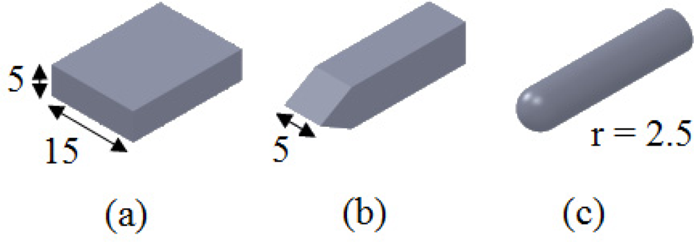 We selected three main local surfaces of objects that are easily discriminated by humans. These were the flat, the edge, and the curved surfaces shown in Figure 1. These objects were made from the same material (steel) and were applied statically to a tactile sensor array to collect the force profiles that they generate. As the contact between the objects and the sensor is static, the stimuli need to be approximately the same size as the sensor. Otherwise, as the sensor is immobilized, large curved objects with large radii will be felt as flat. That is, only a small section of their surface, which has the characteristics of a flat surface, will be in contact with the small sensor. This situation introduces confusion between flat and curved objects in the stage of analysis.