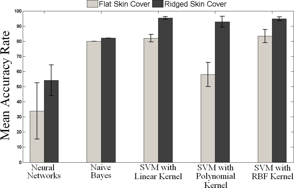 Figure 10 presents the mean accuracy rate obtained for our validation dataset through various learning algorithms. The light gray bars represent the mean value of algorithms’ accuracy rates with flat skin cover and the dark gray shows the mean accuracy rate for the ridged one. From the figure, it can be observed that the ridged skin cover performs better than the flat one in curvature recognition. This agrees with the previous results on capability of fingerprints in performing spectral selection and amplification of the tactile information about physical properties of the objects [22].