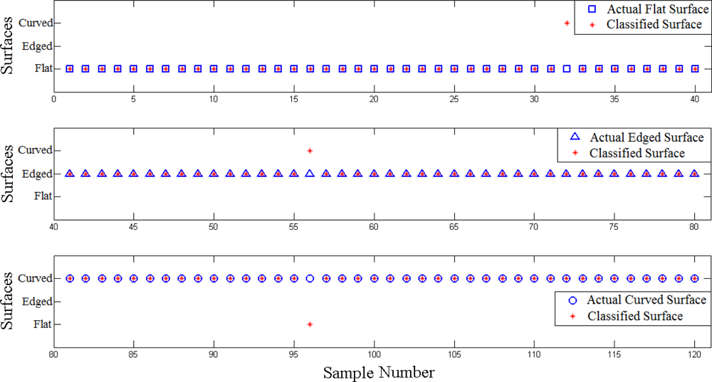 The surface curvatures of the test dataset were discriminated correctly with the accuracy rate of 97.5%. Table 1 indicates the confusion matrix, which shows the number of correctly-detected samples for each curvature. Furthermore, Figure 11 presents the comparison of the actual surface of objects and the predicted surfaces. Of the total of 120 samples collected with ridged skin cover for testing, the first 40 samples in the figure are curved objects, the second 40 are objects with an edge and the third 40 are flat objects.