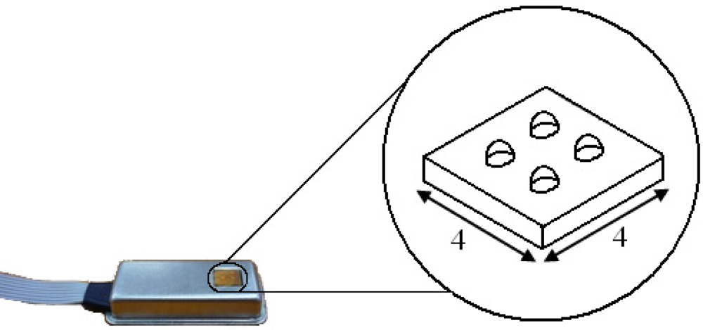 The sensing technology of the sensors is piezoresistive and the size of total active area is 4 mm × 4 mm with 5 mN/bit normal and 2 mN/bit shear sensitivity. This sensor can detect and measure the force values of the contact in both normal and tangential directions. It has been shown that the three-dimensional signals generated by this sensor provide the possibility for basic six Degree Of Freedom (DOF) spatial-temporal tactile measurements on arbitrary objects.