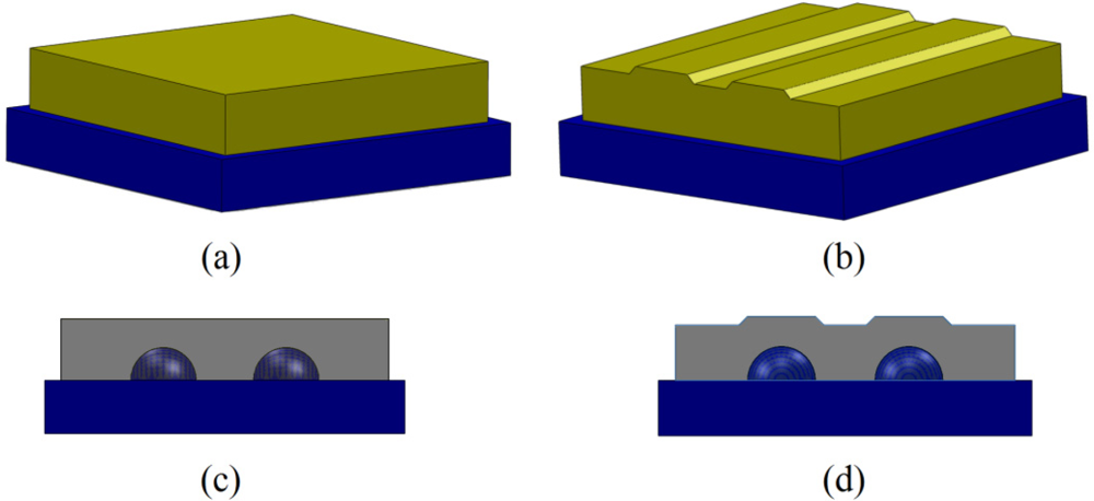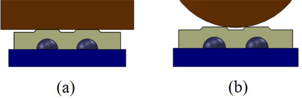 In order to investigate the effect of fingerprints, two skin covers with two different structures were considered [29,30]. One was flat [Figure 3(a)] and the other one was ridged [Figure 3(b)]. These skin covers, which were fabricated from silicone rubber (GLS 40, Prochima, Calcinelli, Italy), were designed to accommodate the rubber bumps from the TactoPad 2 × 2 sensor. The silicone material that was chosen was previously characterized and used for the synthetic skin of a cybernetic hand in [31–33]. This material type was also implemented for prosthetic finger phalanges with lifelike skin compliance [34].