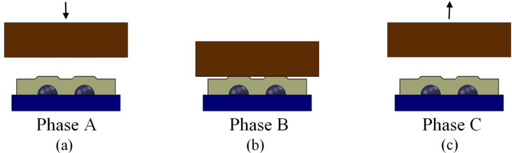 The experimental pattern for all stimuli was to indent the sensor with the rate of 0.5 N/s (Phase A), hold the force for 2 s (Phase B), and then release with the same rate as the indentation (Phase C). The applied force at Phase B, which was approximately 2 N, is the maximum possible force that can be applied to TactoLogic sensor array such that no overload is imposed on the sensor. The three phases of A, B, and C are labeled in Figure 5.