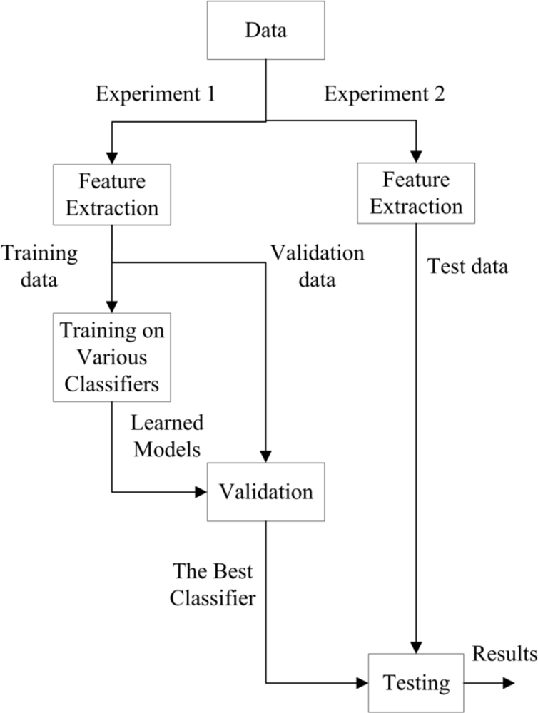 Two separate experiments were carried out and the experimental data were used for learning and analysis. The data collected from the first experiment (Experiment 1, as shown in the left branch of Figure 6) was used for training and data collected from the second experiment (Experiment 2, as shown in the right branch of Figure 6) was held for testing, i.e., strictly no training or validation was done using this data.