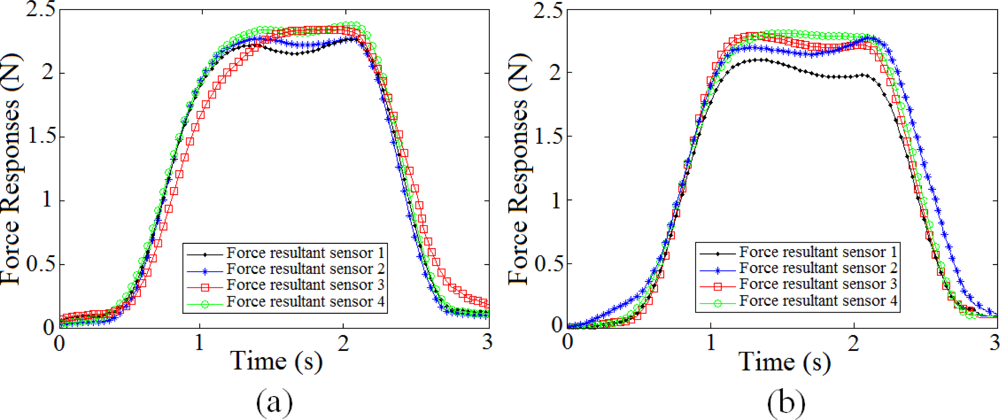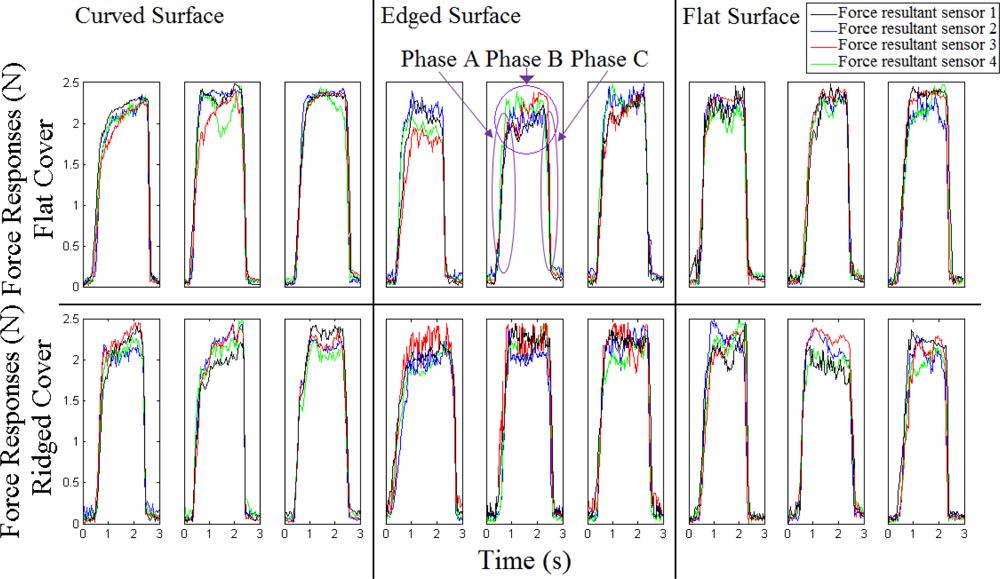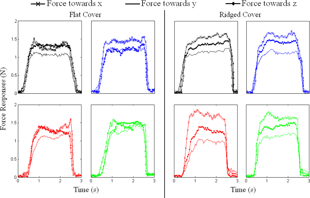 The experimental data for each skin cover with each of the objects is collected from different runs of the experiments carried out in the same condition. Each graph presents four responses corresponding to the resultant forces from the four sensors of the tactile sensor array. The four sensors on the sensor pad are three-dimensional taxels, which are embedded in an array. Due to different embedding errors, these four sensors measure different force values. However, it can be observed from the figure that the repeated measurements from each of the sensors have relatively same values for one skin cover with one surface. Moreover, the symmetrical characteristic of the responses shows that the indentation and release are made at the same rate.
