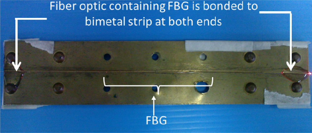 The polyimide coating of the FBG is removed before the FBG is inscribed using a 244 nm ultraviolet (UV) laser exposure with a phase mask, using hydrogen-loaded fibers. The peak reflectivity values are typically 90% and the Bragg wavelength located around 1,550 nm at room temperature. The physical grating lengths are set to 2 cm length for all samples. A bimetallic sheet measuring 150 mm (height) × 32 mm (width) × 8.4 mm (thickness) is used. The FBG is glued on the bimetallic sheet using UV cured Norland Optical Adhesive (number 61). The glue has a melting temperature of 125 °C. The bimetallic sheet consists of brass and steel riveted together. The FBG was bonded onto the brass surface, which has the higher CTE. Figure 1 shows the FBG-Bimetal temperature sensor assembly.