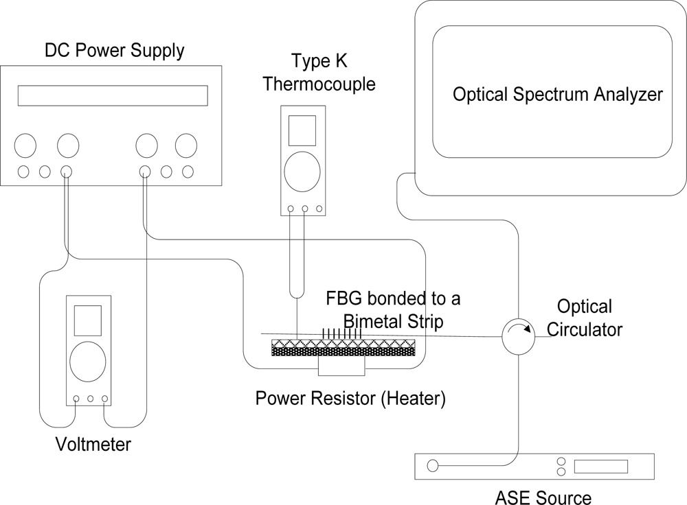 A DC power source controls the voltage supply to a 50 W, 100 Ω power resistor which functions as a heater. The voltmeter monitors the voltage supply. Type K thermocouple temperature sensor was used to monitor the temperature of the bimetallic sheet. Amplified Spontaneous Emission (ASE) source (NP2000ASE, Nuphoton Technologies) supply C-band light into the FBG and the reflected Bragg wavelengths are monitored by an optical spectrum analyzer (FTB-5240S/BP Optical Spectrum Analyzers, EXFO). The voltage of the DC power source is gradually increased in order to increase the temperature of the bimetallic sheet. The corresponding Bragg wavelength for each temperature increment is recorded. The wavelength shift of the FBG mounted onto the bimetal is characterized with respect to the temperature changes and the elongation of bimetal. Repeat measurements are taken to account for various errors.
