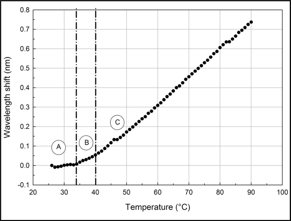 The result of the characterization process is shown in Figure 3. As the temperature increases, the wavelength shift also increases. Figure 3 shows that three different regions have been identified and are labeled as A, B and C, respectively.