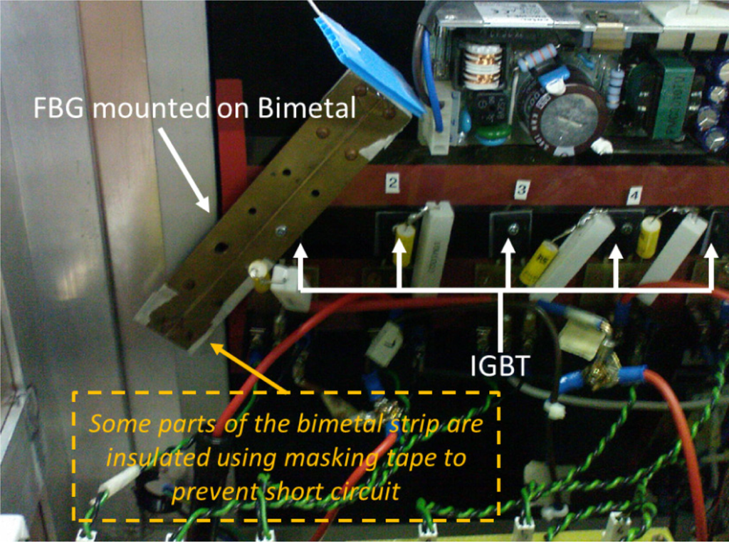 Tian [16] and Song [17] bonded FBGs to the lower CTE side of a bimetal and used it as a sensor to measure temperature and strain. In this work, we propose to improve the sensor’s sensitivity by bonding the FBG to the higher CTE side of a bimetal. The FBG-Bimetal temperature sensor is first characterized in order to understand its behavior. Although the FBG-Bimetal temperature sensor is affected by the strain and temperature effects simultaneously, we are able to separate the two components in order to determine the temperature of the IGBT.