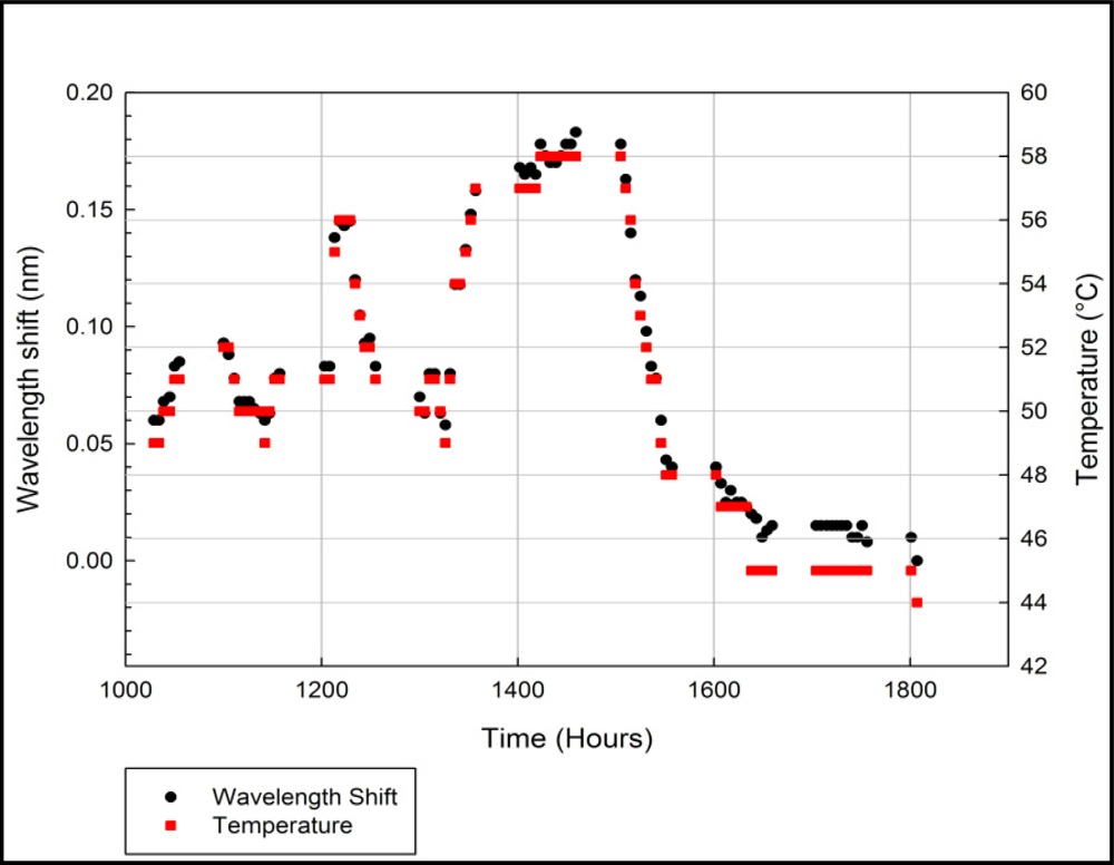 From Equation (1), it is apparent that the Bragg wavelength, λB, is depended on the effective index of refraction, neff and the spacing between gratings, Λ. The effect of temperature to the Bragg wavelength under constant strain is dominated by the thermo-optic effect, which accounts for 95% of the total effect. The wavelength shift due to temperature effect on an FBG is given by [10]: