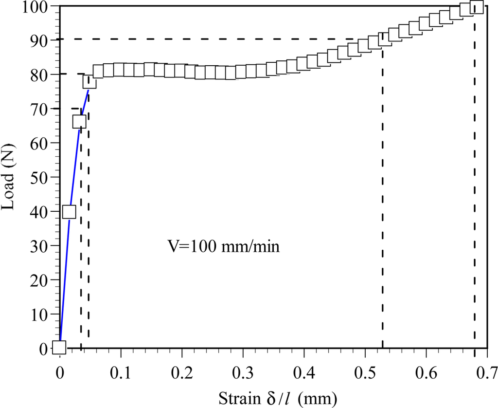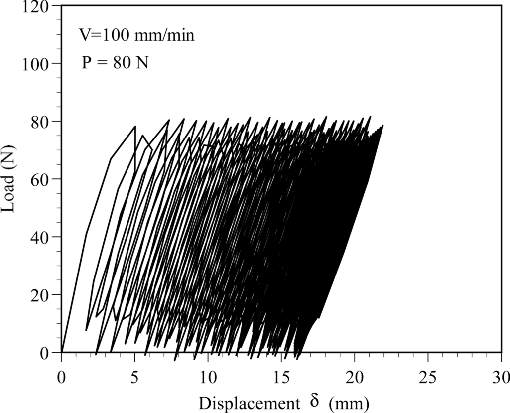 According to Burgers’ model, it can be seen from Figure 1 that the retarded elastic deformation and permanent deformation are still retained in the POF specimen when the applied loading is removed. The recovery of retarded elastic deformation begins when the load is released and it takes a period of time to finish the process. This is because the retarded elastic deformation arises from the transformation of a given equilibrium conformation into an elongated structure. The applied load level shown in Figure 4 is 80 N, which is lower than the yielding load of the POF specimen used. Generally, the polymer chains of the POF will be rearranged when the POF specimen is subjected to load. However, while the load is being removed, the unloading rate of 100 mm/min could be too fast for polymer chains to recover from their elongated structures to the original equilibrium conformations. This may result in retention of the retarded elastic deformations and the production of irrecoverable viscous flows which are due to polymer chains slipping past one another. The irrecoverable viscous flow dissipates the majority of its energy as heat, and exhibits the phenomenon known as hysteresis loops, as shown in Figure 4. When the next load-unload cycle begins, the elongated polymer chain will be stretched again, and the total retarded and irrecoverable permanent deformations increase with increasing load cycles.