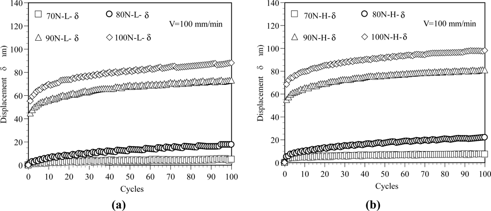 In the following discussions, the lowest load in the unloading process and the highest load in the elongation test process are denoted as L-Load and H-Load. The lowest load is 0 N in the elongation test process and the highest load in unloading process is defined as the load level in experiments. Figure 5 shows the variation of displacement with respect to the cycles for various load levels. The displacement-cycles curves obtained from the L-Load are shown in Figure 5(a) and the curves obtained from the H-Load are shown in Figure 5(b). The profile of the displacement curve for the L-Load is similar to the result for the H-Load. The results shown in Figure 5 indicate that the displacement increases with the increasing number of cycles. As the results in Figure 5(a) show, the total displacements can be obtained as 4.9, 17.6, 73.1 and 88.0 mm at 100 cycles for the L-Load with load levels of 70 N, 80 N, 90 N and 100 N, respectively. A higher load level results in a larger elongation in the POF specimen. The corresponding total displacements for the H-Load are 7.2, 21.9, 81.0 and 98.1 mm, as shown in Figure 5(b). Comparing the results shown in Figure 5(a,b), the H-Load has a larger displacement than L-Load does. This can be attributed to the retarded strain and viscous elastic strain of the polymer material.